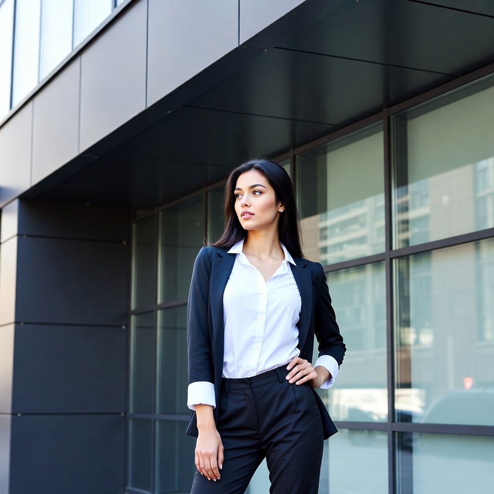 A young woman with long dark hair stands confidently in front of a sleek black glass building. She wears a tailored black blazer, white collared shirt, and slim black pants, with hands on hips. Large reflective windows and urban architecture frame her pose.
