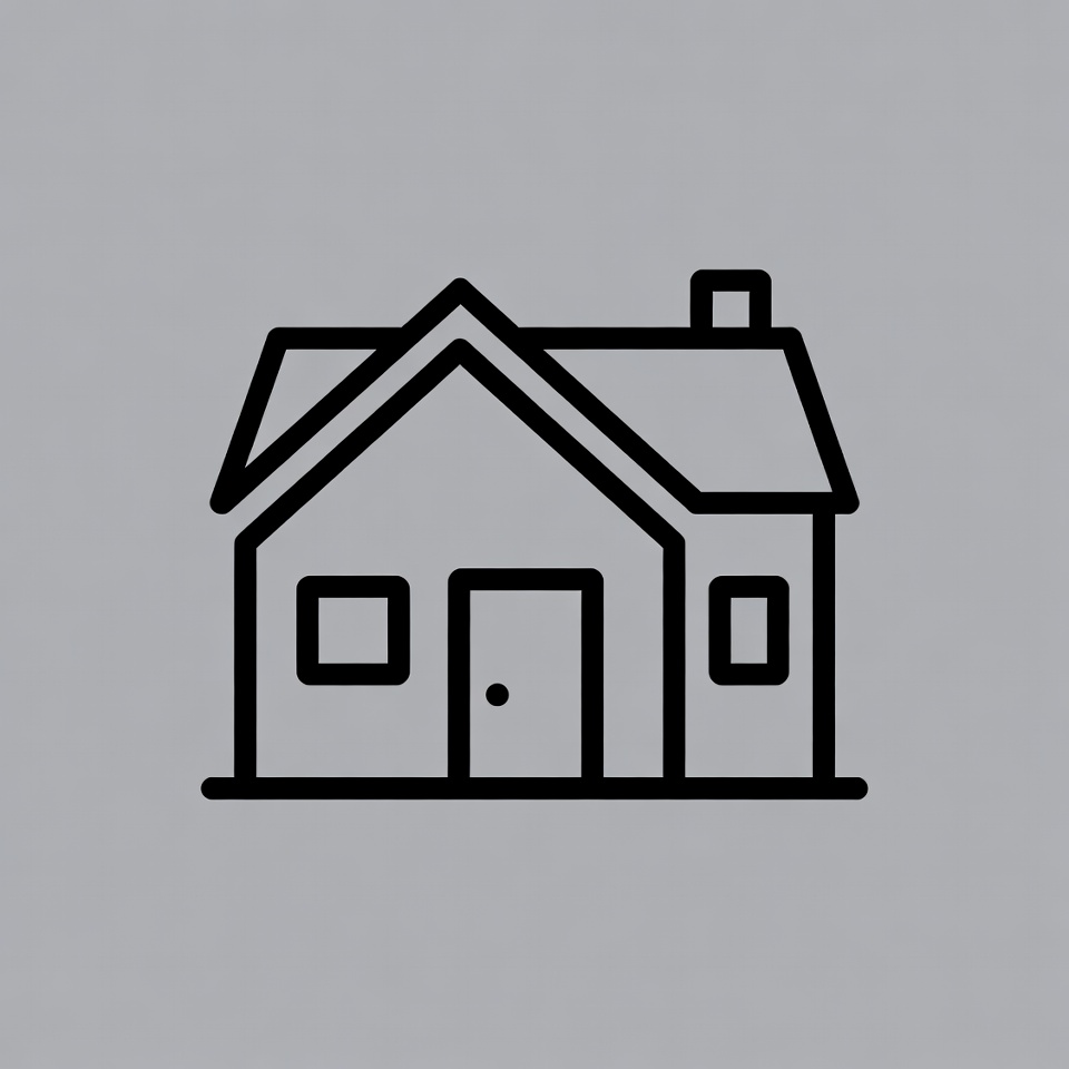 A minimalist black line drawing of a house on a gray background. The house features a gabled roof with a chimney, a front door, and two windows. It has clean outlines and an isolated design.