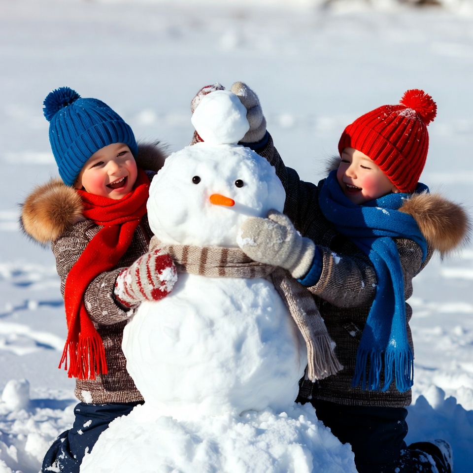 Two young children, a boy in a blue knitted hat and scarf and a girl in a red knitted hat and scarf, are building a snowman in the snowy outdoors. They wear fur-trimmed coats and mittens, with the boy tossing a snowball and the girl placing snow on the snowman. The snowman has a carrot nose, stick arms, and a scarf.