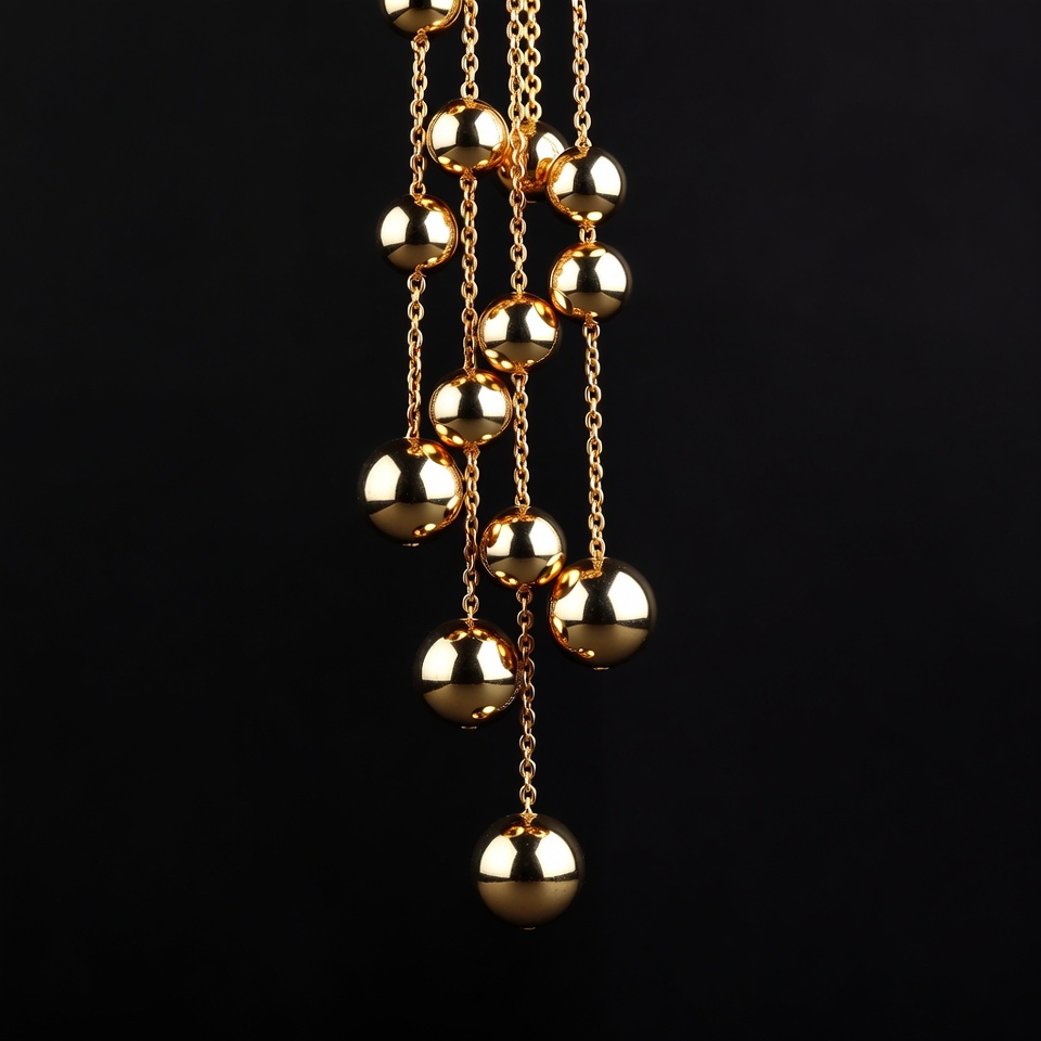 beaded chain, beaded necklace, chain necklace, dangling beads, fashion accessory, gold beads, gold chains, gold jewelry, isolated background, jewelry, long necklace, luxury jewelry, necklace, shiny gold, gold necklace