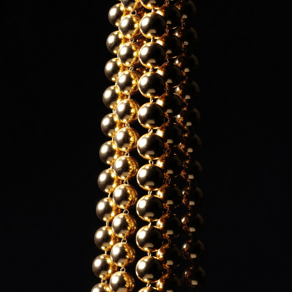 A long strand of shiny gold beads arranged vertically against a black background. Each bead is round and reflective, creating highlights from the light. The necklace forms a dense, elegant column of metallic spheres.