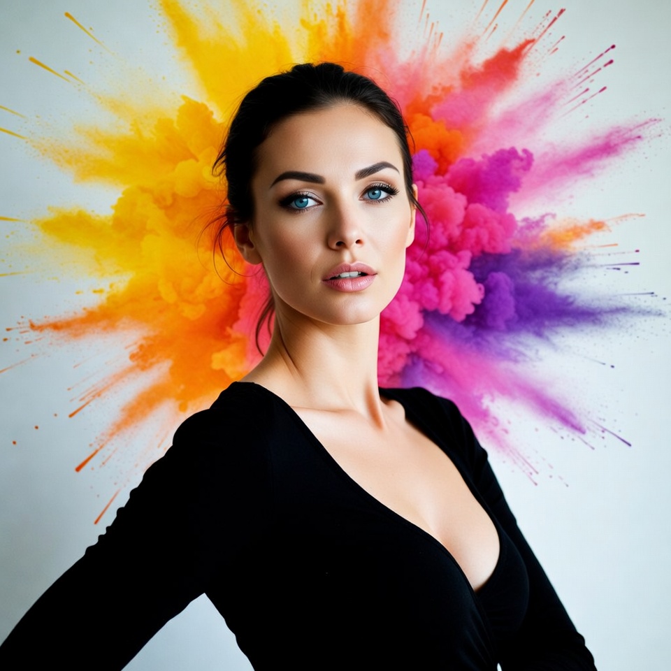 A woman with long dark hair in a bun poses confidently in front of a vibrant explosion of yellow, orange, pink, and purple powder. She wears a form-fitting black dress with a deep neckline and has striking blue eyes and full lips. The powder bursts dramatically behind her against a white background.