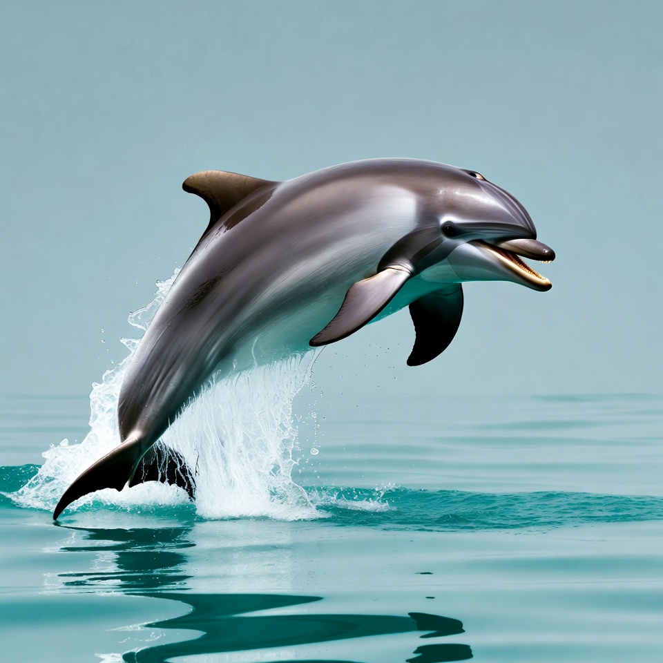 A bottlenose dolphin leaps high out of the blue ocean water with its mouth open and flippers extended. White water splashes around its sleek gray and white body as it jumps dynamically. The background features calm turquoise waves.