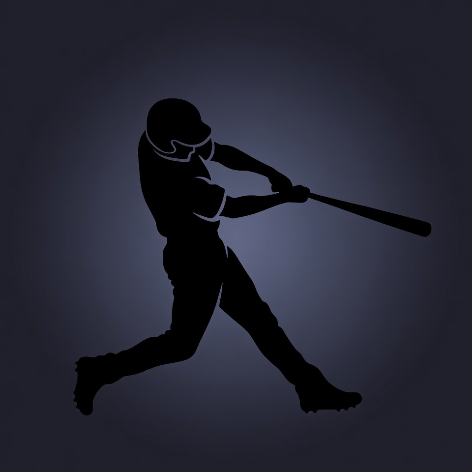 A black silhouette of a male baseball player in a batting stance swings a bat dynamically. He wears a helmet, baseball uniform with short sleeves, pants, and cleats. The figure is isolated against a dark blue gradient background.