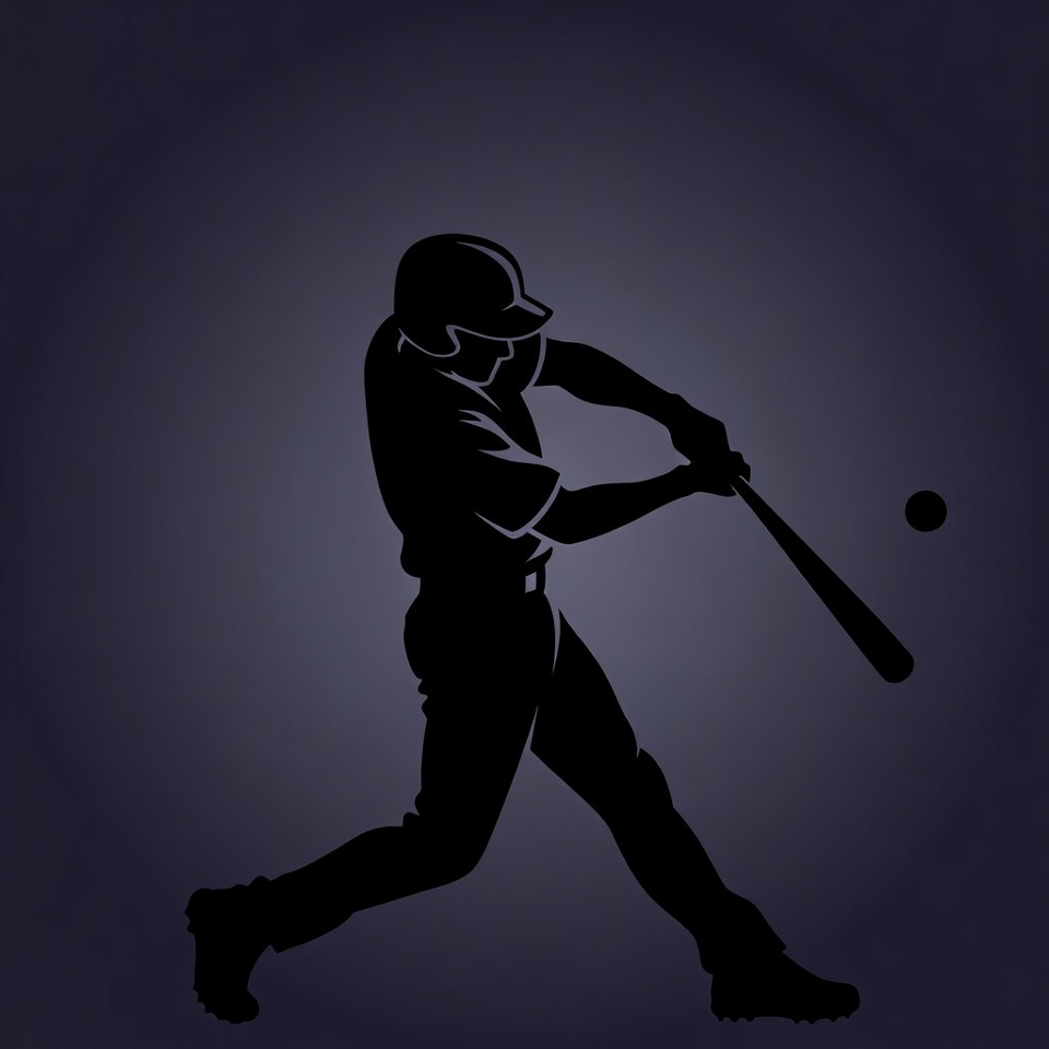 A black silhouette of a male baseball player in uniform swings a bat at an incoming ball. He wears a helmet, jersey, pants, and cleats while in a dynamic batting stance. The illustration is set against a dark gradient background.