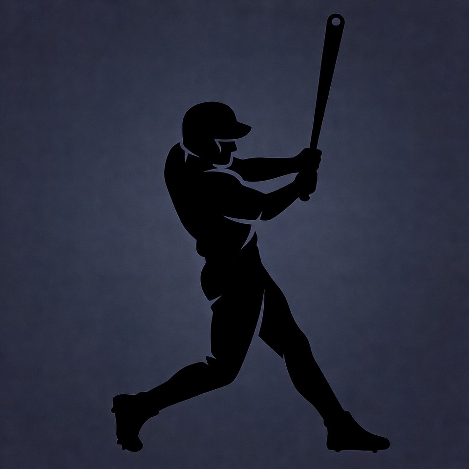 A black silhouette of a male baseball player in a batting stance swings a bat on a textured navy blue background. He wears a helmet, uniform, and cleats. The illustration emphasizes dynamic motion and athletic form.