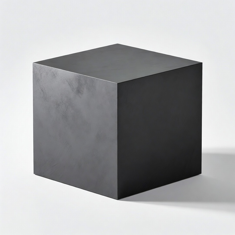 A solid black cube with a slightly textured surface sits centered on a plain white background. The cube is perfectly square and isolated with even lighting highlighting its edges.