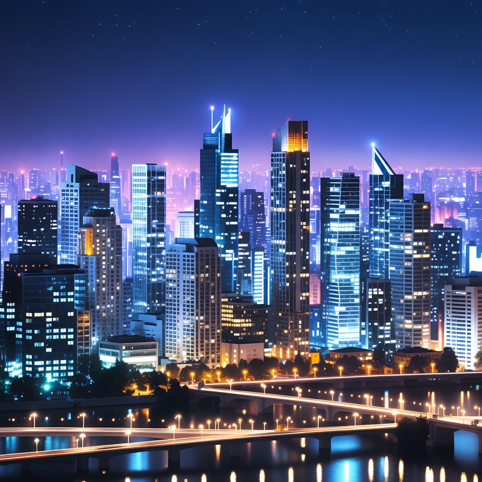 blue lights, bridge lights, bridges, city lights, cityscape, cyberpunk city, futuristic city, glowing buildings, illuminated skyline, modern architecture, neon lights, night city, night view, pink lights, river reflection, skyscrapers, tall buildings, urban landscape, waterfront city, city skyline