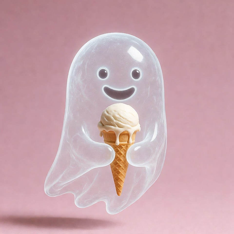 A cute transparent ghost with big smiling eyes holds a vanilla ice cream cone on a pink background. The ghost is rendered in a 3D cartoon style with glossy effects. Dripping ice cream adds a playful touch to the illustration.