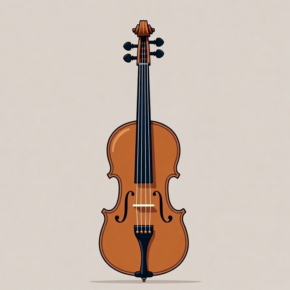 A detailed vector illustration of a violin stands upright against a plain beige background. The violin features a polished brown wooden body, black fingerboard, and four tuning pegs. It has classic f-holes and a tailpiece with fine tuners.