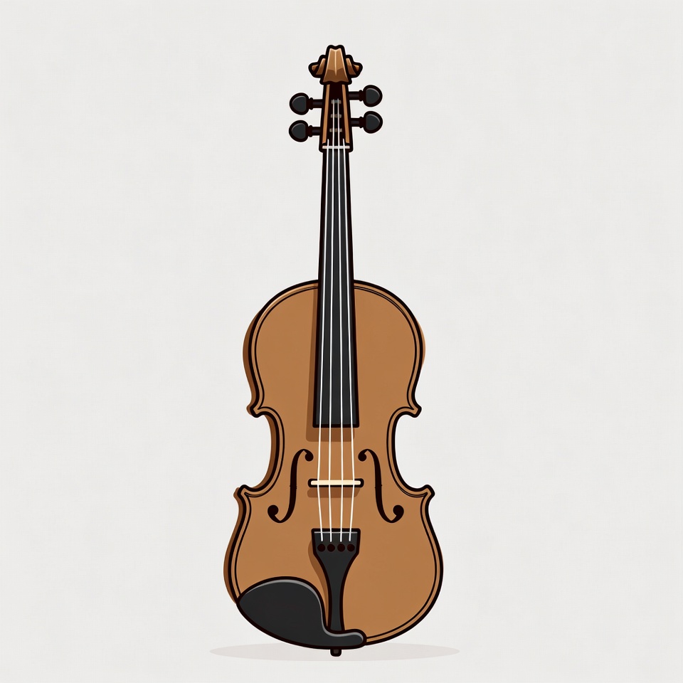 A detailed vector illustration of a violin with a brown wooden body and black chin rest. The instrument features four tuning pegs, f-holes, and a bridge on a plain gray background. It is depicted in a front view, standing upright.