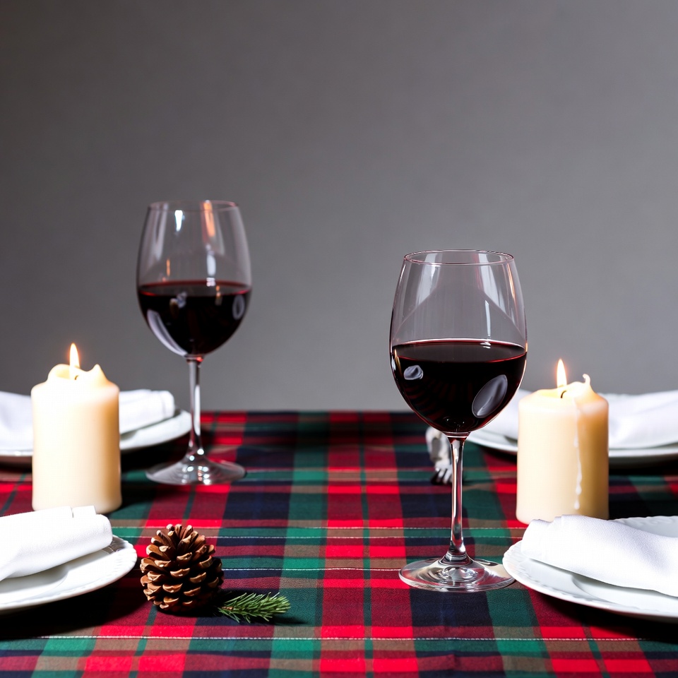 candles, dinner table, evergreen sprig, festive table, glasses, holiday decor, isolated background, lit candles, napkins, pine cone, plaid tablecloth, table setting, tablecloth, wine, wine glasses, yellow candles, red wine