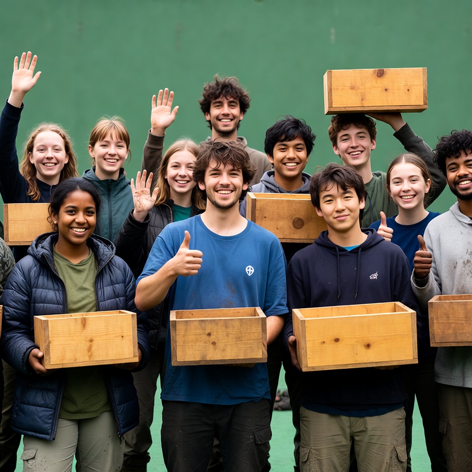 A diverse group of young adults, including males and females of White, Asian, African-American, and Multiracial ethnicities, stands together on a green background. They hold wooden crates and raised hands, with some giving thumbs up and smiling. Many wear casual outdoor clothing like jackets and hoodies.