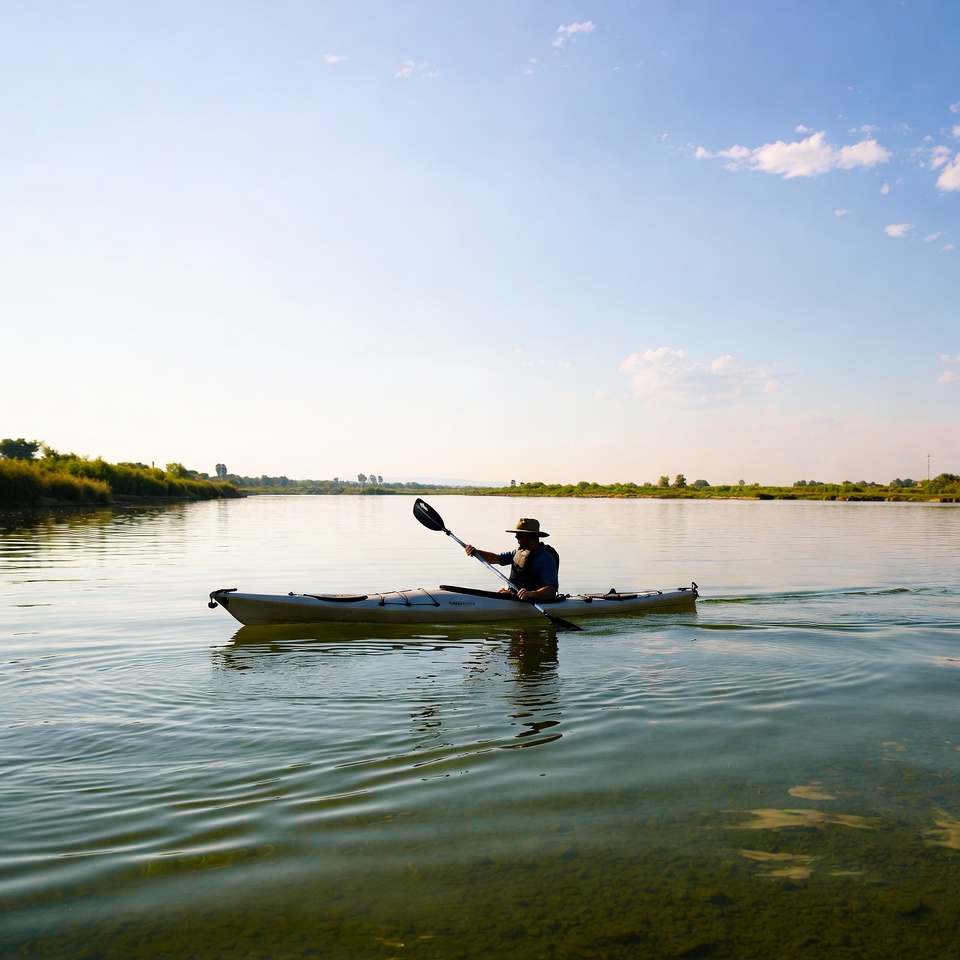 A man wearing a dark shirt and hat paddles a yellow kayak on a calm river. He holds a paddle with both hands while surrounded by clear blue skies and distant bridges. Reeds line the riverbanks in the background.