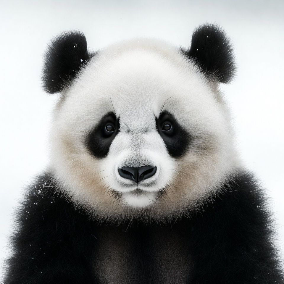 adorable, animal portrait, baby panda, black white fur, cute animal, fluffy, isolated background, large eyes, panda face, snow, snowflakes, wildlife, winter, panda