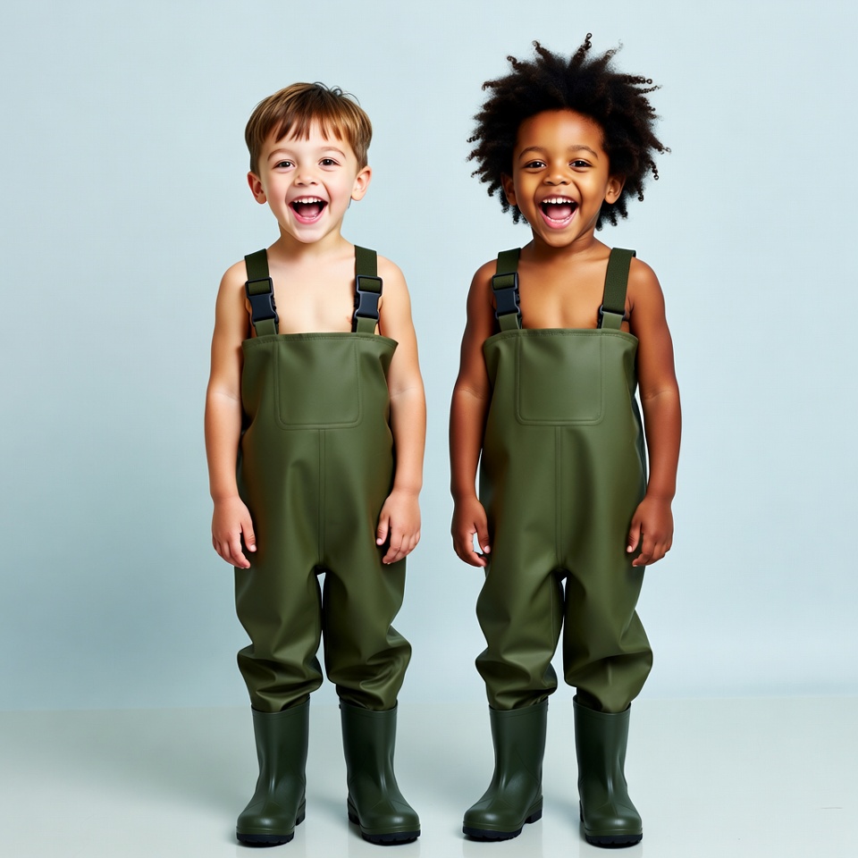 Two young boys stand side by side on a light blue background, both wearing matching green rain overalls and tall green rain boots. One boy has brown hair and fair skin, while the other has curly black hair and dark skin. They are smiling happily with their arms at their sides.