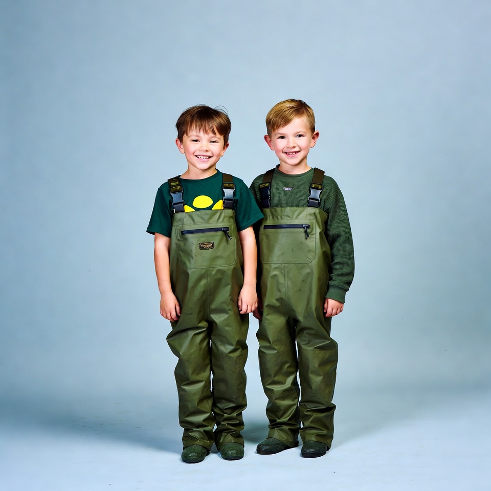 White, brothers, fishing overalls, green bibs, green boots, green overalls, green shirts, isolated background, kids clothing, male, short hair, smiling boys, standing pose, sun graphic, two boys, waterproof overalls, yellow sun, young boys, boys