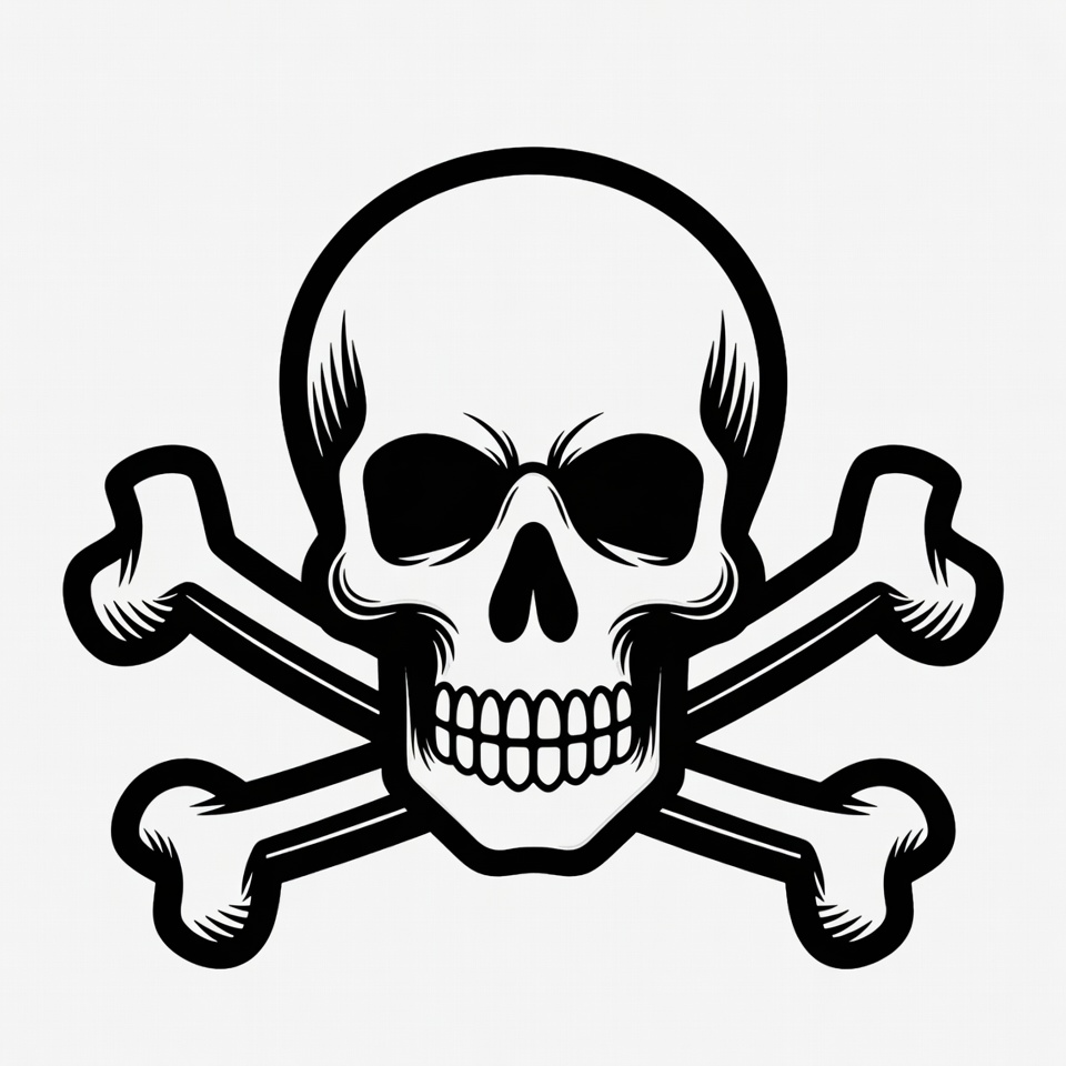 A bold black skull and crossed bones illustration on a white background. The skull features detailed outlines with empty eye sockets and grinning teeth. It is rendered in a classic vector clipart style.