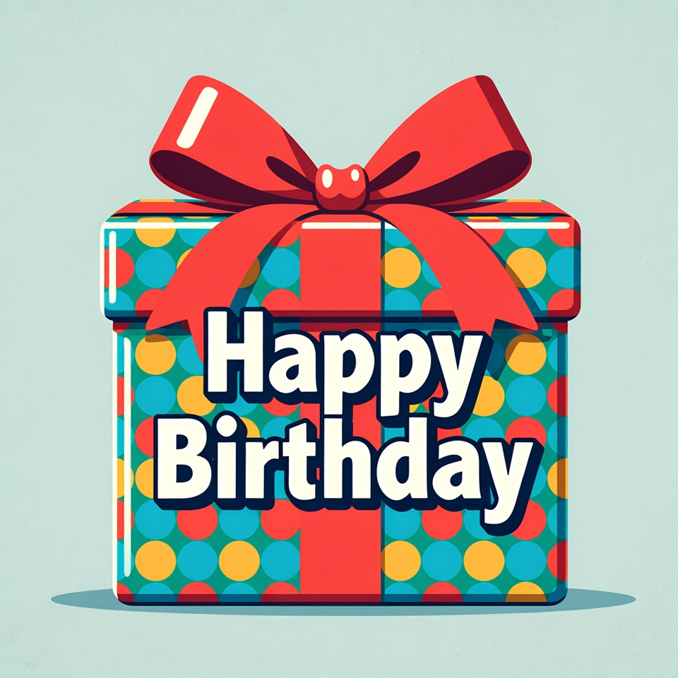 A colorful illustrated gift box with polka dots in teal, yellow, and red sits on a light blue background. A large red ribbon bow wraps around the box. Bold white text reading 'Happy Birthday' appears on the front.