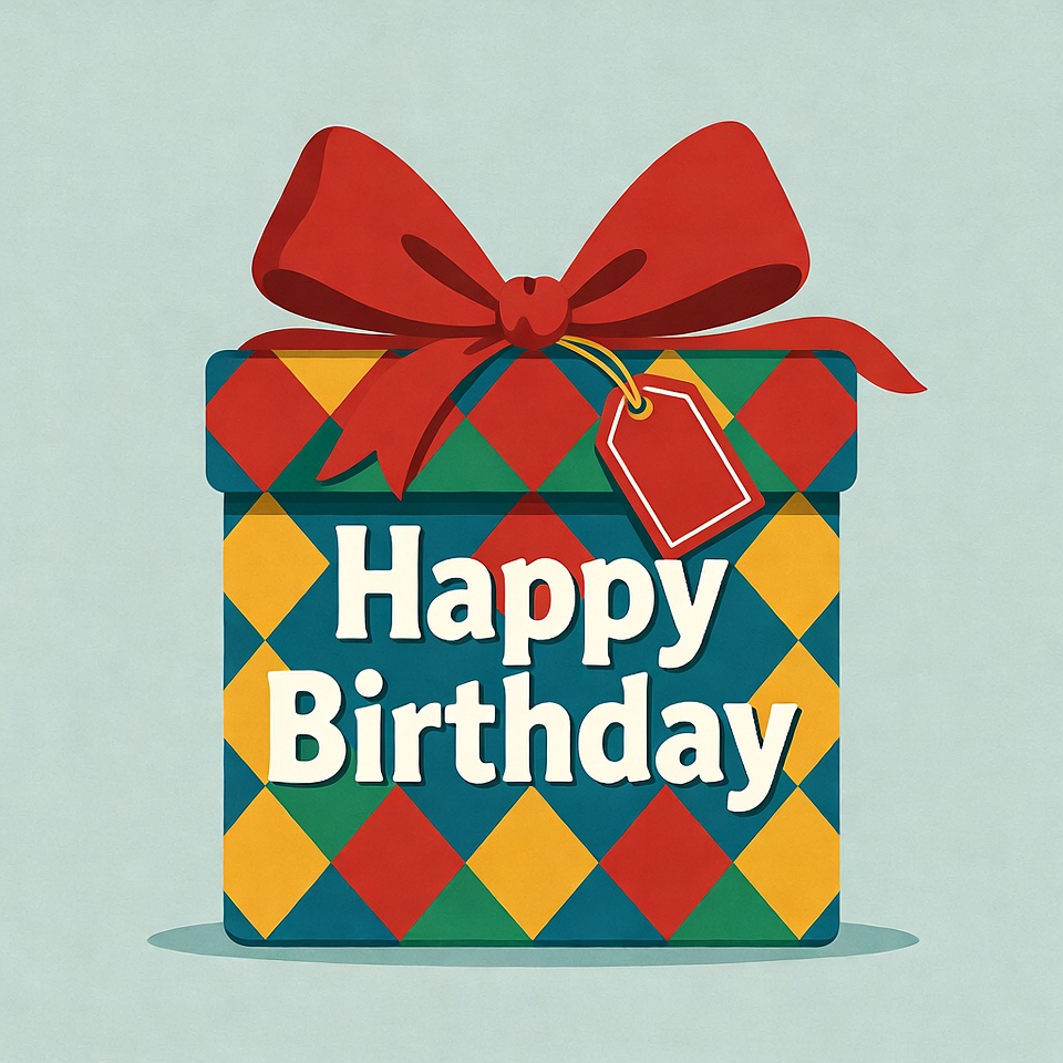 A colorful gift box with a harlequin pattern in red, blue, and yellow features a large red bow on top. A red price tag hangs from the bow. Bold white text reading 'Happy Birthday' is centered on the box against a light blue background.