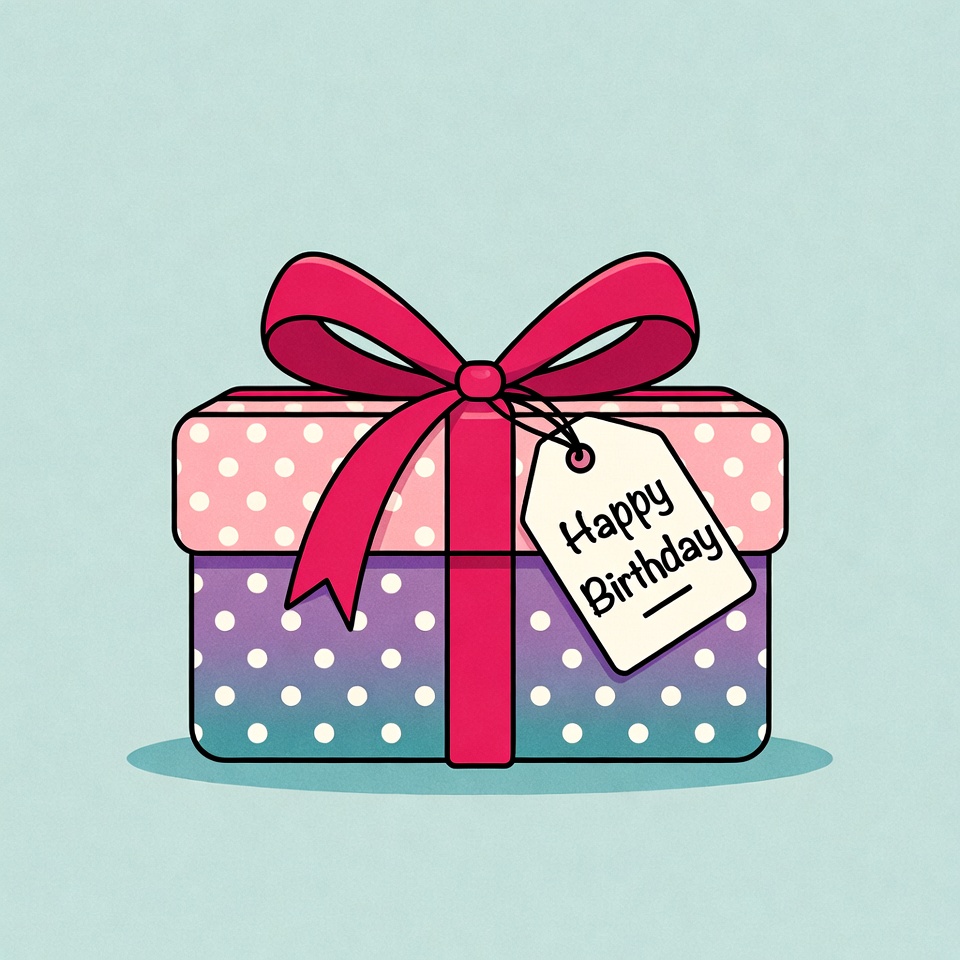 A colorful illustrated birthday gift box features pink polka dots on a purple base. It is wrapped with a large red ribbon and bow, and a white tag labeled 'Happy Birthday' hangs from the bow. The gift sits on a light blue background.