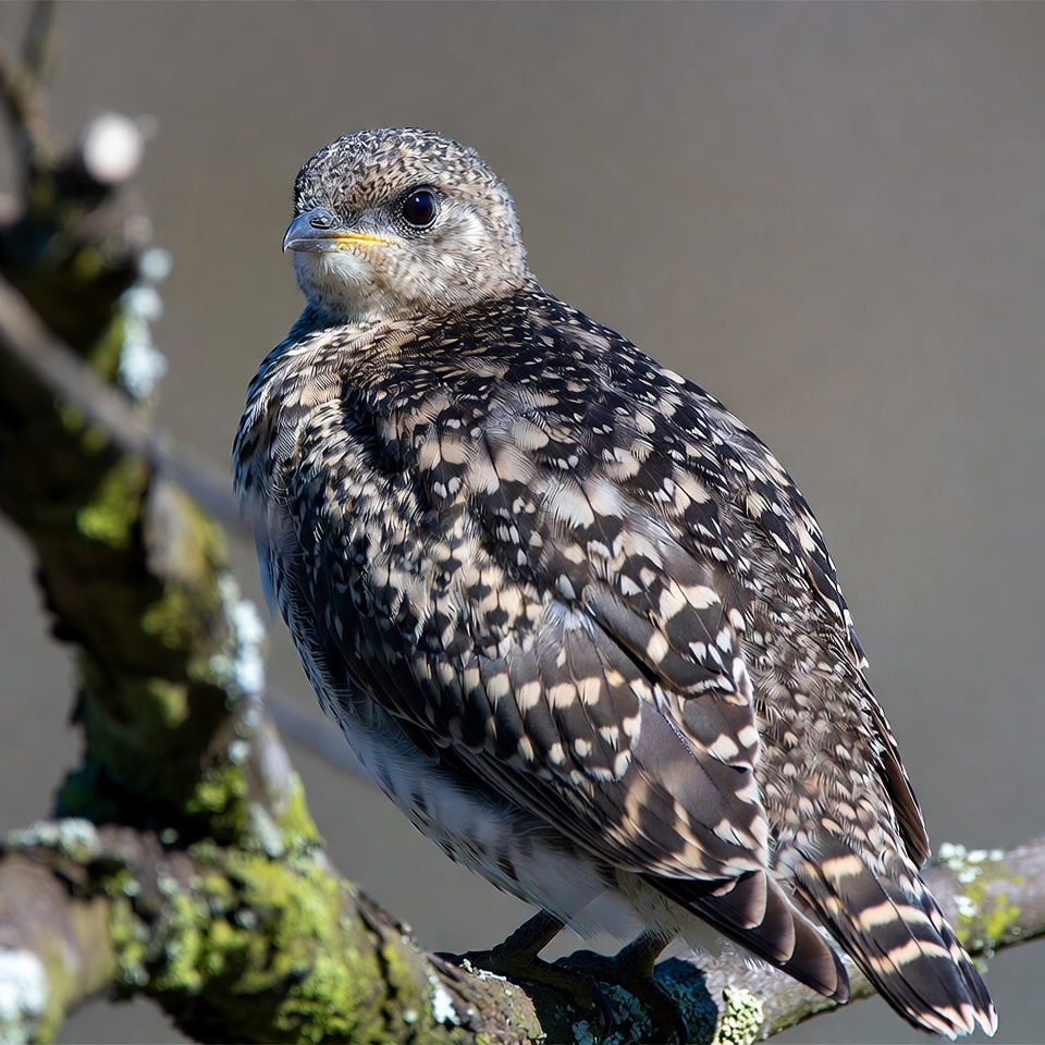 avian, baby bird, bird, bird eye, brown bird, chick, feathers, fledgling, mossy branch, natural habitat, nature, outdoors, perch, spotted feathers, tree branch, white spots, wildlife, yellow beak, spotted chick