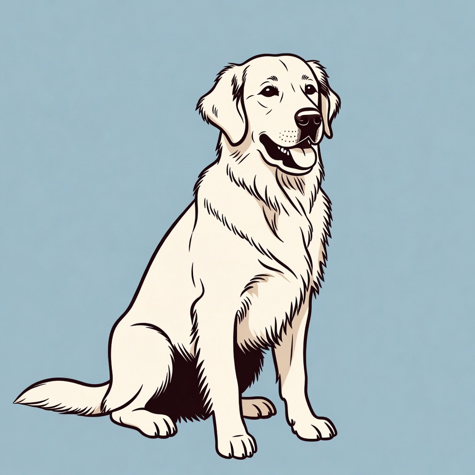 blue background, breed, canine, clipart, dog, drawing, fluffy fur, illustration, isolated background, line art, pet, sitting dog, smiling dog, tongue out, vector art, white dog, Golden Retriever