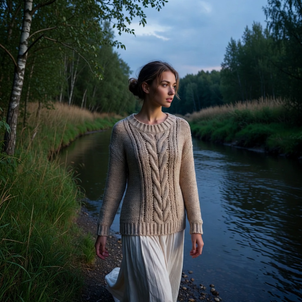 A woman with brunette hair in a bun stands by a serene riverbank surrounded by birch trees and tall grass. She wears a beige cable knit sweater and a flowing white skirt, with her hands gently swinging as she walks on pebbles. The scene is set during twilight with a cloudy sky and lush green forest in the background.