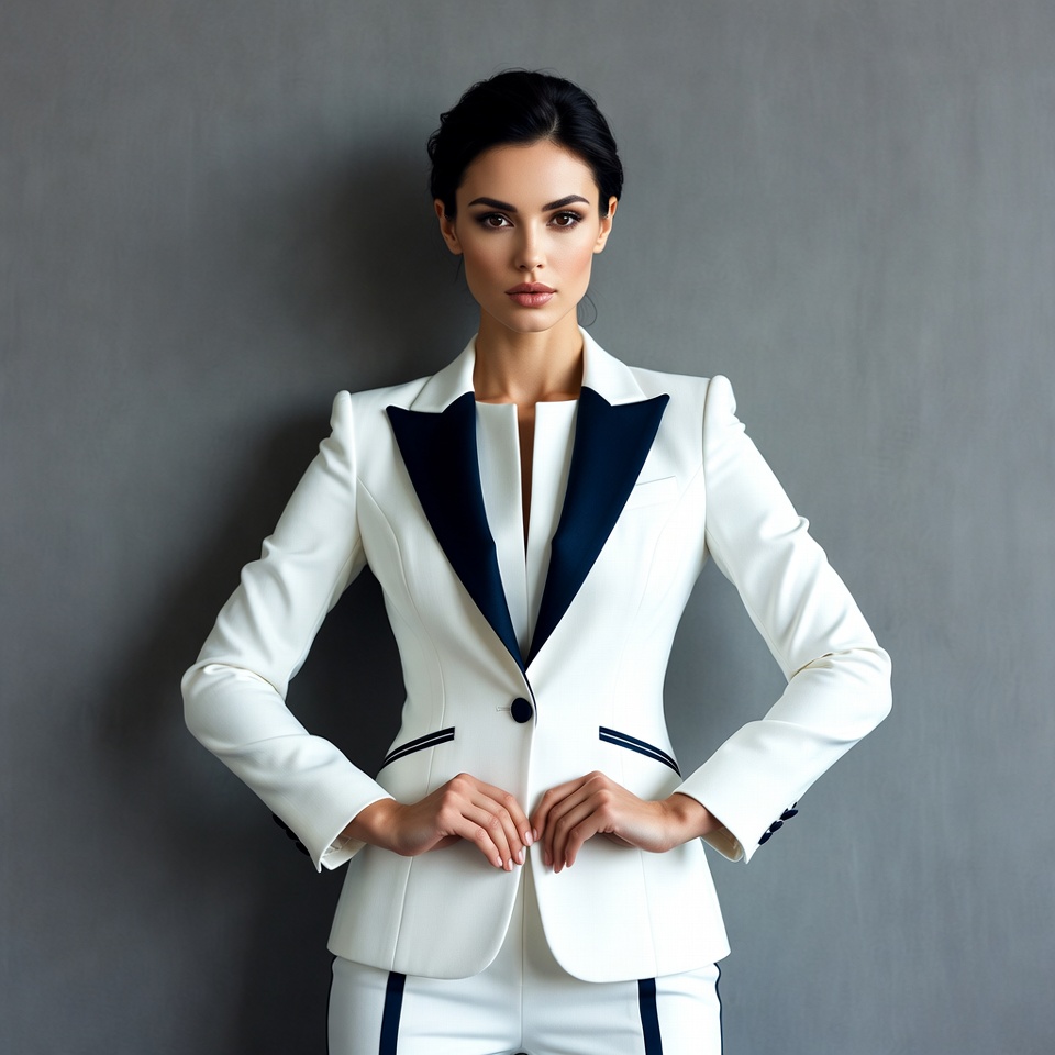 A woman with long dark hair stands confidently against a gray background. She wears a stylish white blazer with black lapels and matching pants. Her arms are crossed in front of her with hands clasped.