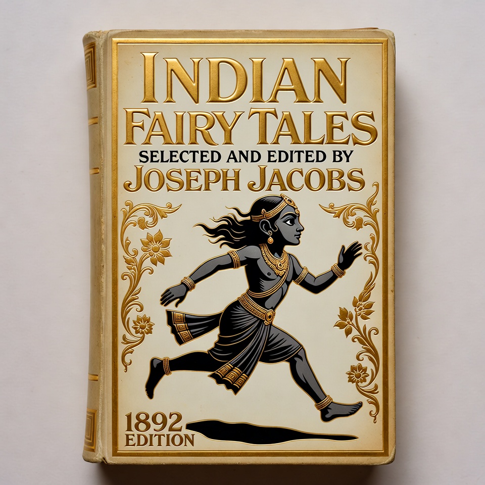 1892 edition, Asian girl, Indian fairy tales, Indian folklore, Indian girl, Joseph Jacobs, beige background, classic literature, embossed cover, fairy tales, floral design, flowing hair, gold lettering, illustration, jewelry, ornate border, running girl, traditional sari, vintage book, book cover