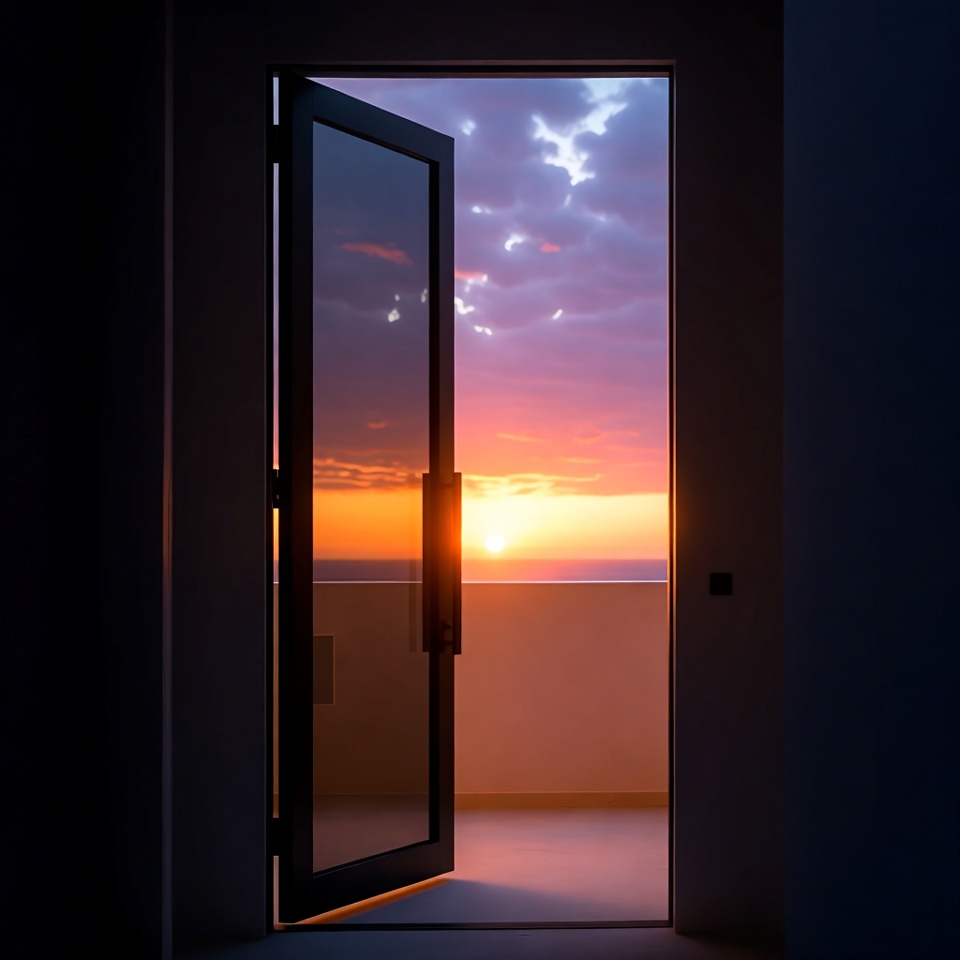 A modern glass door stands open, framing a vibrant sunset over the ocean. The sky glows with orange, pink, and purple hues, with scattered clouds and the sun dipping toward the horizon. A balcony extends beyond the door with a subtle railing visible.