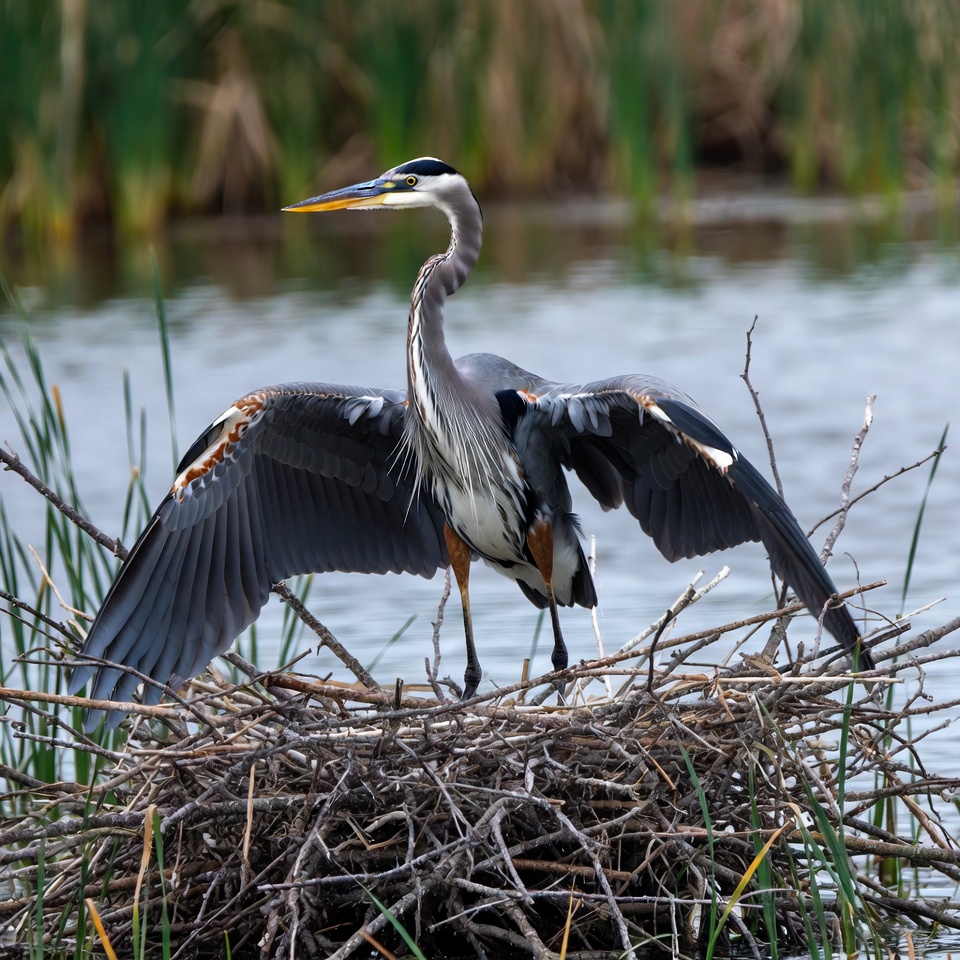 A great blue heron stands tall on a nest made of sticks surrounded by green reeds and calm water. Its wings are partially spread, revealing dark feathers with white and gray accents, and a long yellow beak. The bird's neck is extended, and orange legs are visible beneath the nest.