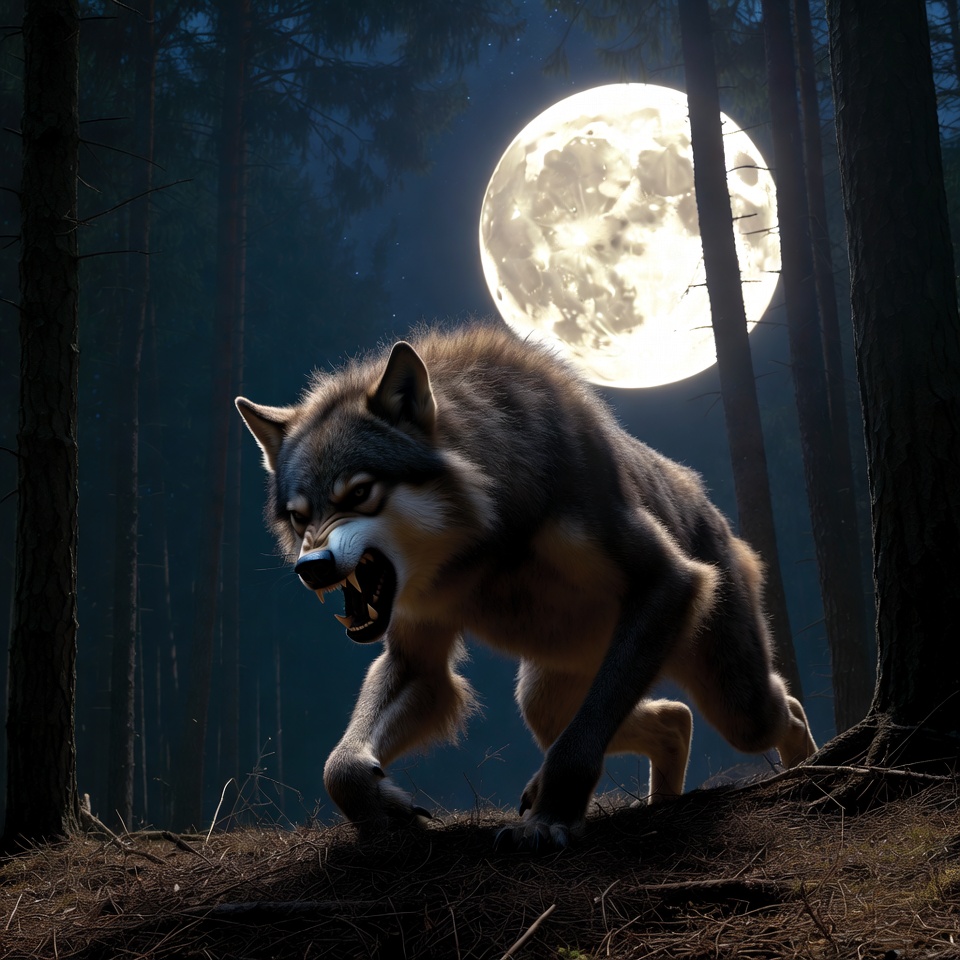 A snarling gray wolf with glowing eyes crouches aggressively in a dark forest. A large full moon illuminates the tall pine trees surrounding it. The wolf's fur is detailed with brown and white accents on an isolated forest ground.