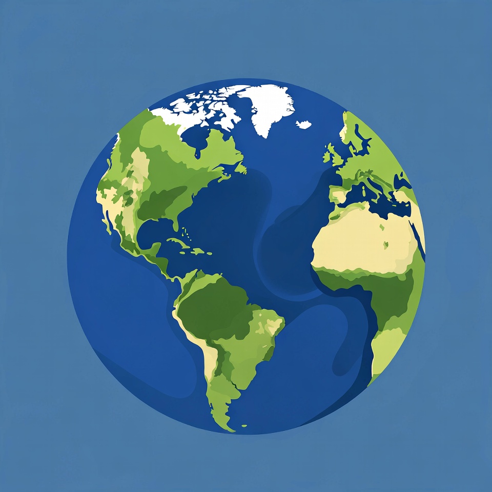 A colorful illustration of the Earth globe shows green continents, blue oceans, and white polar ice caps. The planet is depicted in a flat design style with varying shades of green for landmasses and deep blue for seas. It is centered against a solid blue background.