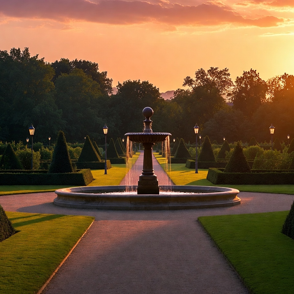 dusk, evening light, formal garden, garden, garden fountain, gravel path, green trees, greenery, hedge garden, hedges, landscape, landscaping, lanterns, orange sky, ornate fountain, outdoor fountain, park, pathways, stone fountain, sunset, symmetrical garden, topiary, twilight garden, water fountain, fountain