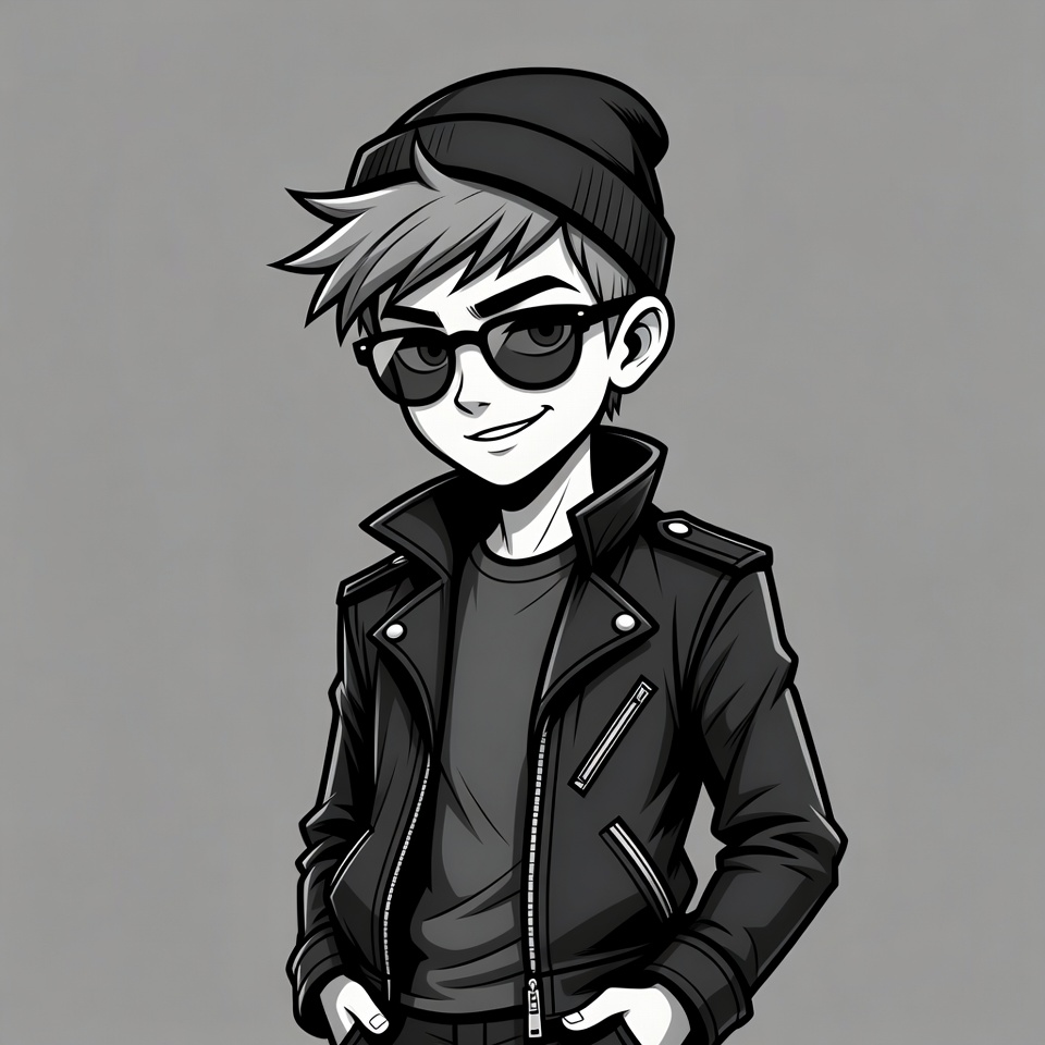 anime illustration, black beanie, black t-shirt, boy, cartoon, chibi style, cool boy, gray background, hands in pockets, illustration, isolated background, leather jacket, male, smiling, spiky hair, standing pose, stylish boy, sunglasses, vector art, young boy, anime boy