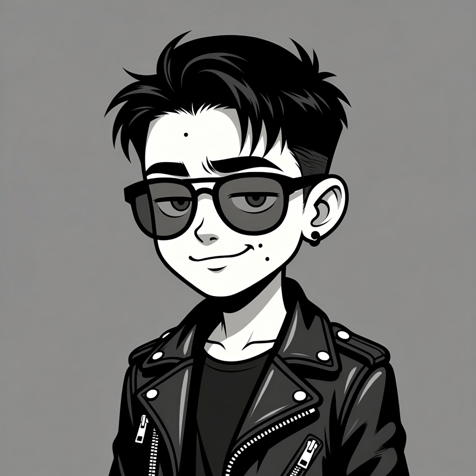 Asian, black and white, black hair, black shirt, cartoon, chibi style, cool pose, earring, edgy look, gray background, illustration, isolated background, leather jacket, line art, male, mole, portrait, rocker boy, smile, spiky hair, stylish boy, sunglasses, young boy, anime boy