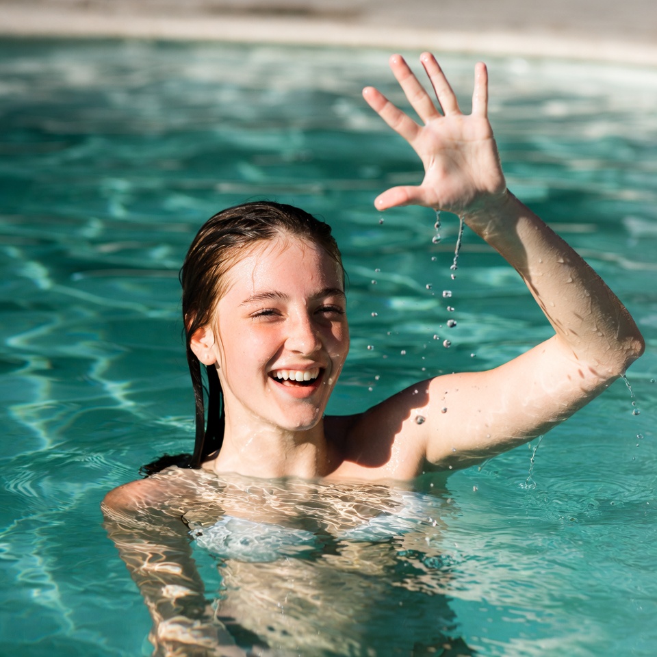 White, blue water, brown hair, child, female, happy face, pool water, poolside, raised arm, smiling girl, splash, summer, sunlight, swimming, swimming pool, swimsuit, teenager, water droplets, waving hand, wet hair, young girl, girl