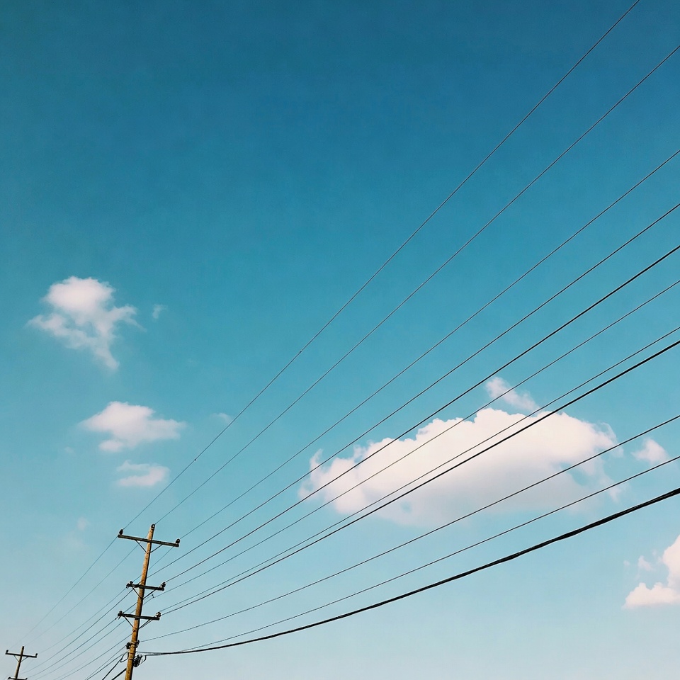 blue sky, clear sky, electric poles, electricity, infrastructure, outdoors, poles, power lines, sky, transmission lines, white clouds, wires, wooden poles, utility poles
