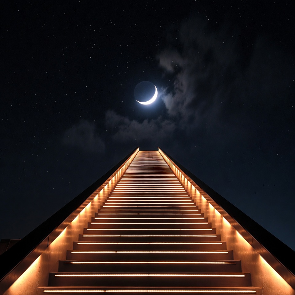 A tall stairway with warm golden lights ascends into a dark night sky. A bright crescent moon shines above surrounded by wispy clouds and stars. The perspective looks straight up the center of the stairs against a black backdrop.