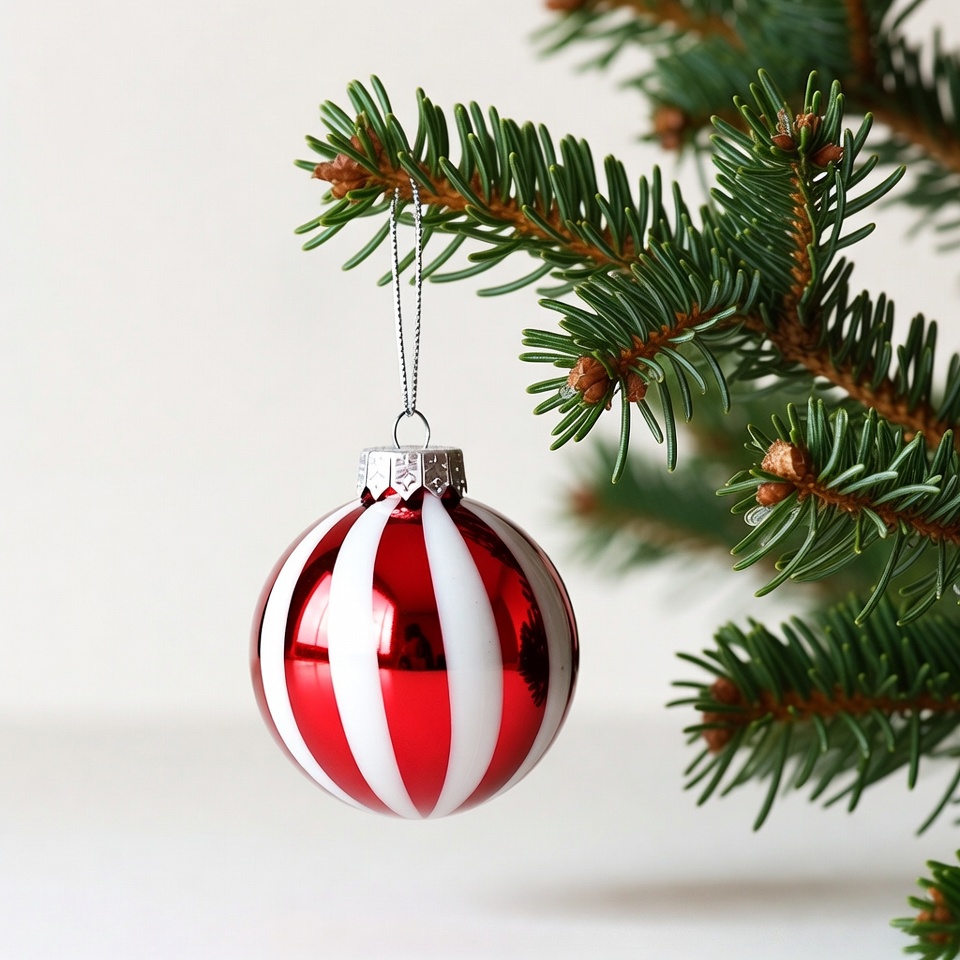 Christmas ball, Christmas tree, bauble, branch detail, evergreen needles, festive decor, fir tree, glossy bauble, hanging string, holiday decoration, isolated background, pine branch, pine needles, red ornament, red white stripes, shiny gloss, silver top, striped ball, white background, white stripes, winter holiday, Christmas ornament