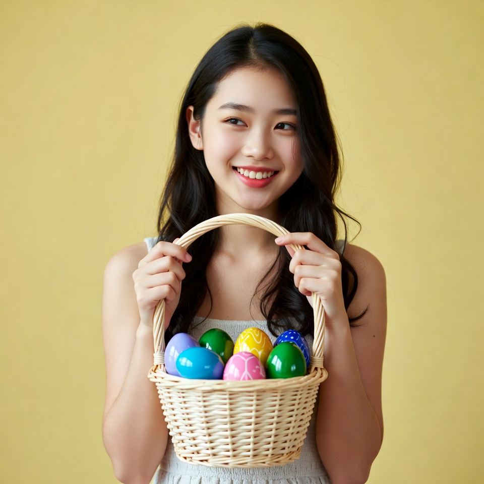 A young Asian woman with long black hair smiles while holding a woven basket filled with colorful Easter eggs. She wears a light-colored dress and stands against a solid yellow background. The eggs in the basket feature various vibrant patterns and shades including blue, pink, and green.