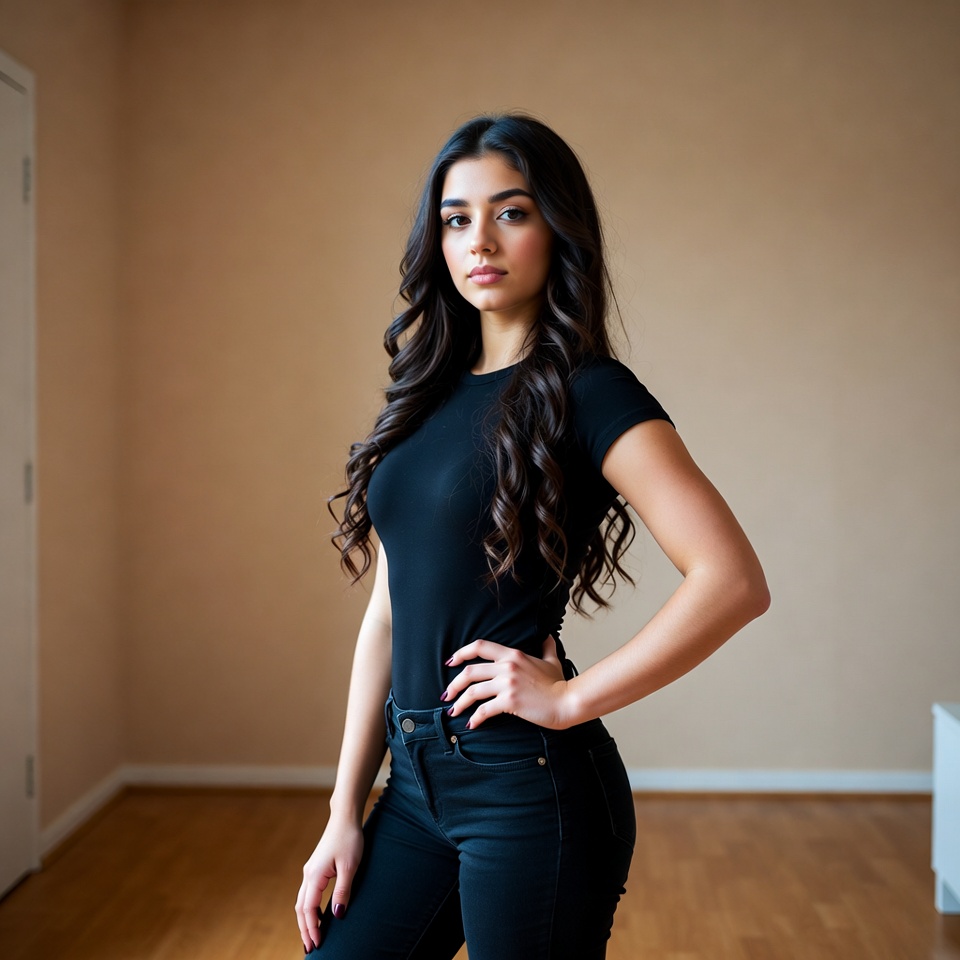 A young woman with long curly dark hair stands in a simple indoor room with beige walls and wooden floor. She wears a fitted black t-shirt and tight black jeans, with her hand on her hip and a slight smile. She faces the camera at a three-quarter angle.