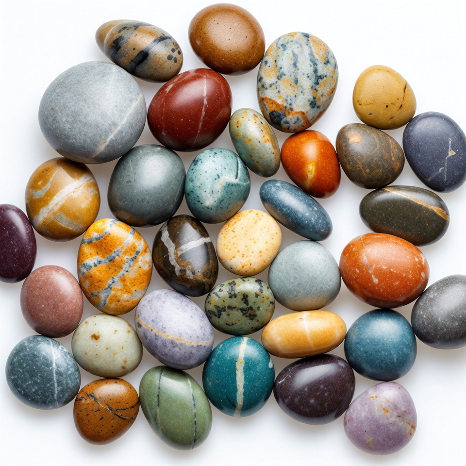 agate stones, brown stones, colorful rocks, earthy tones, gemstones, gray stones, isolated background, jasper rocks, marbled pebbles, mineral collection, natural stones, orange stones, oval stones, purple stones, rock collection, smooth pebbles, stone pile, teal stones, tumbled stones, veined rocks, white background, polished stones