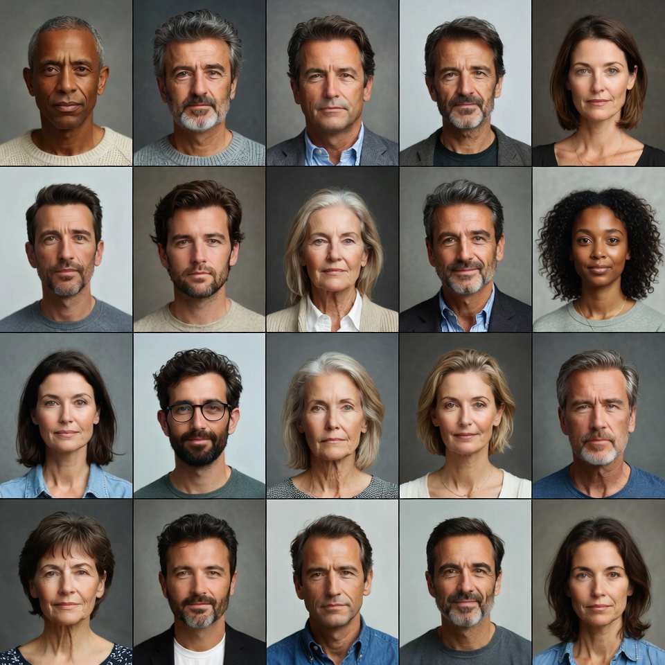 A grid of 25 close-up headshot portraits features men and women of various ages and ethnicities. They wear business casual clothing like sweaters, blazers, and collared shirts in neutral colors. Each person gazes directly at the camera against plain gray backgrounds.
