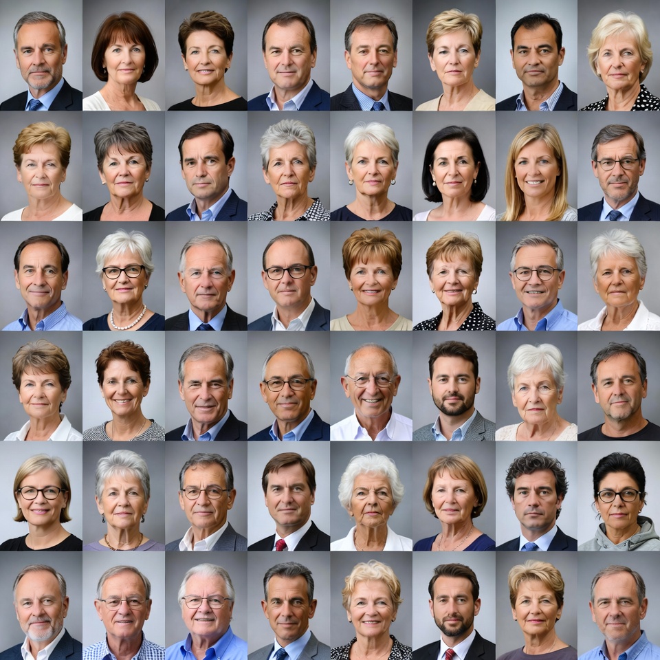 A large grid displays numerous headshot portraits of men and women in professional attire. The individuals wear suits, blazers, and formal clothing, with neutral expressions and direct gazes at the camera. The arrangement forms a structured collage of diverse faces on a plain background.