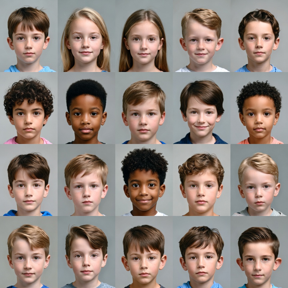 A grid of 25 close-up portrait photos features young children with diverse ethnicities and hairstyles. The boys and girls have neutral expressions and wear casual shirts in various colors. All images are arranged in a 5x5 layout on a plain background.