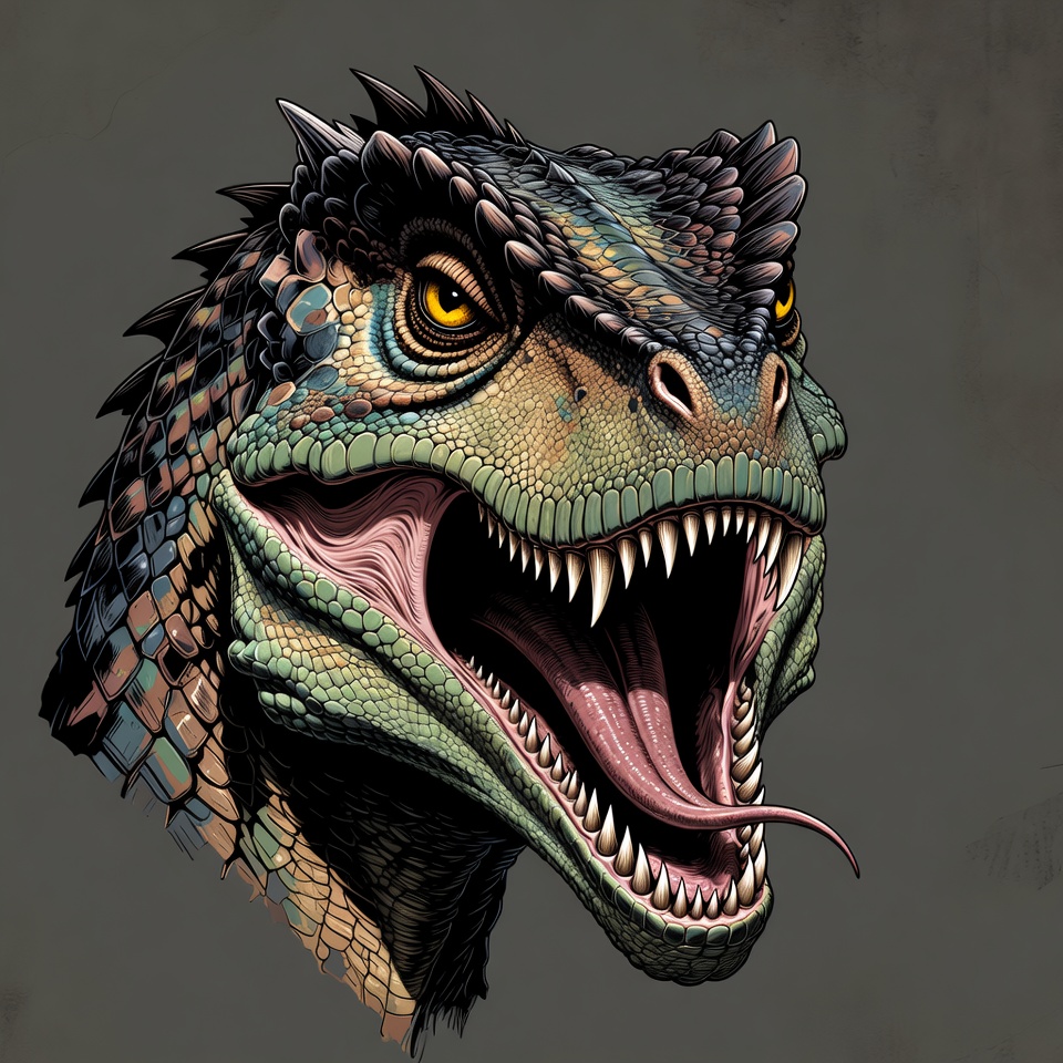 A detailed digital illustration of a velociraptor dinosaur head with green and teal scales. It has sharp spines along its crest, yellow glaring eyes, and a wide-open mouth revealing long fangs and a long tongue. The fierce creature is set against a dark textured background.