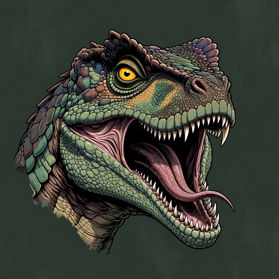 Jurassic, carnivore, closeup, detailed scales, digital art, dinosaur, fierce, green dinosaur, head, illustration, long tongue, monster, open mouth, prehistoric, profile view, raptor, reptile, roaring, scales, sharp teeth, vibrant colors, wild animal, yellow eyes, T-Rex