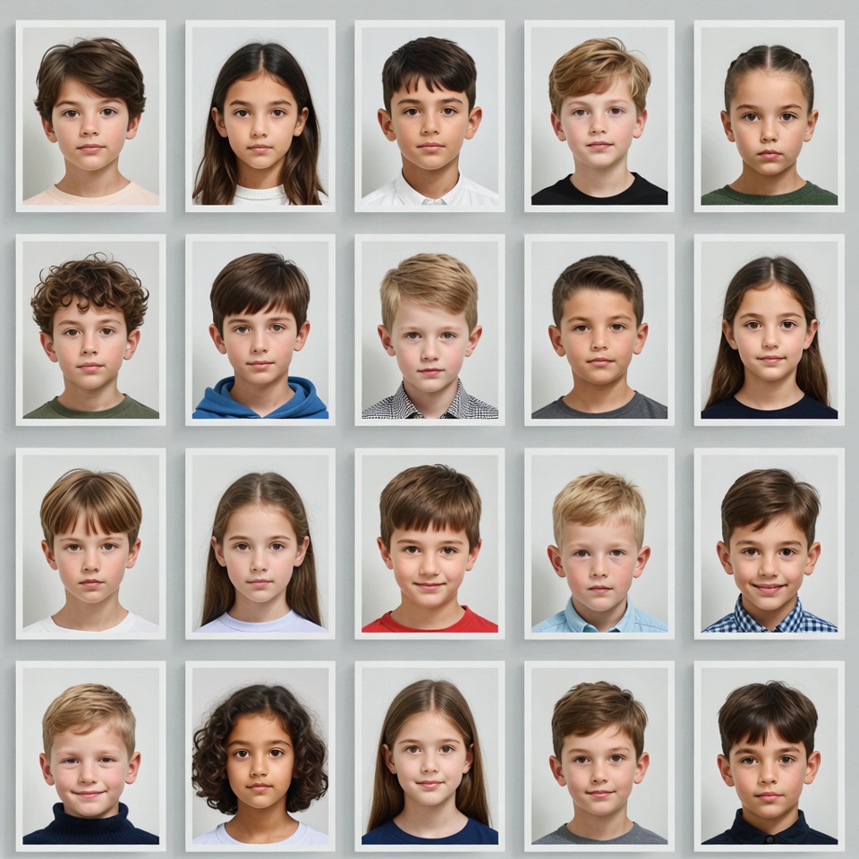 A grid of passport-style headshot photos features multiple young children with diverse hairstyles and clothing. The children, both boys and girls, display neutral expressions against plain gray backgrounds. The arrangement forms a 6x5 layout of individual portraits.